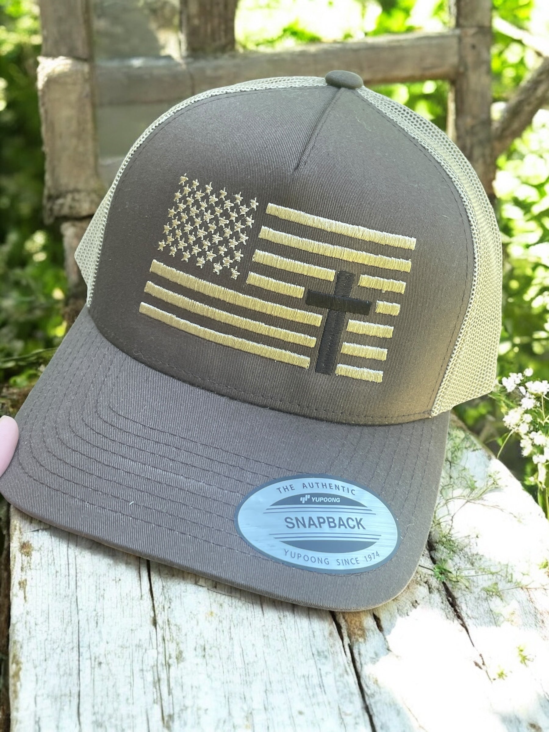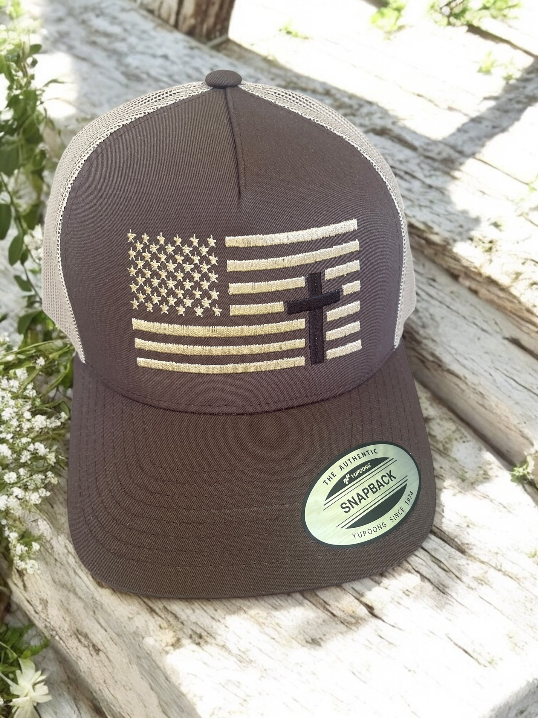 Show your pride in faith and country with this embroidered snapback trucker hat. Featuring a bold American flag design with a cross seamlessly integrated into the stripes, this hat is a symbol of strength, belief, and freedom.