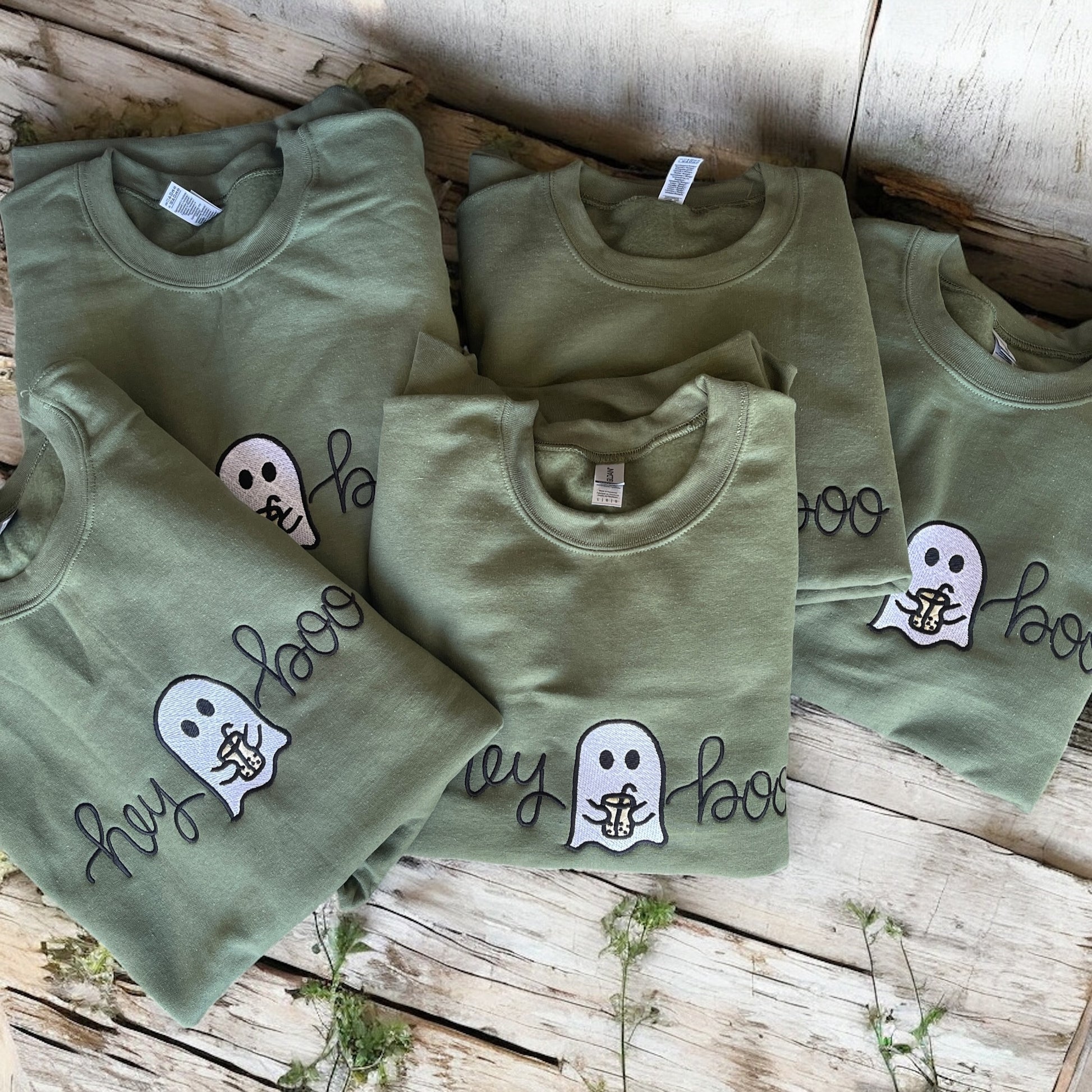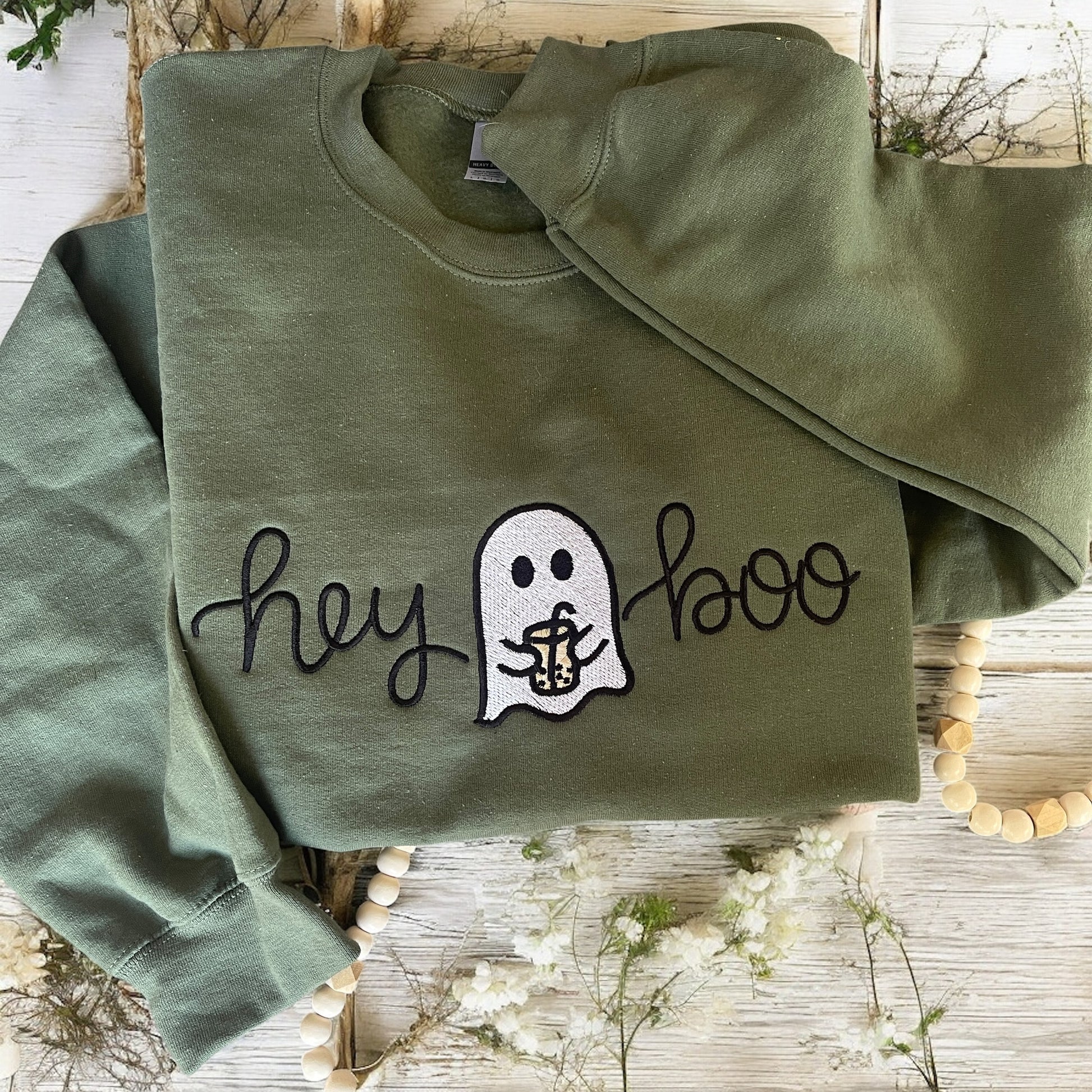 Spooky season just got a whole lot cuter. This cozy crewneck features a sweet little ghost holding a seasonal sip and the playful phrase “hey boo” in stitched script. Perfect for pumpkin patch runs, chilly bonfire nights, or just vibin’ with your fall brew.