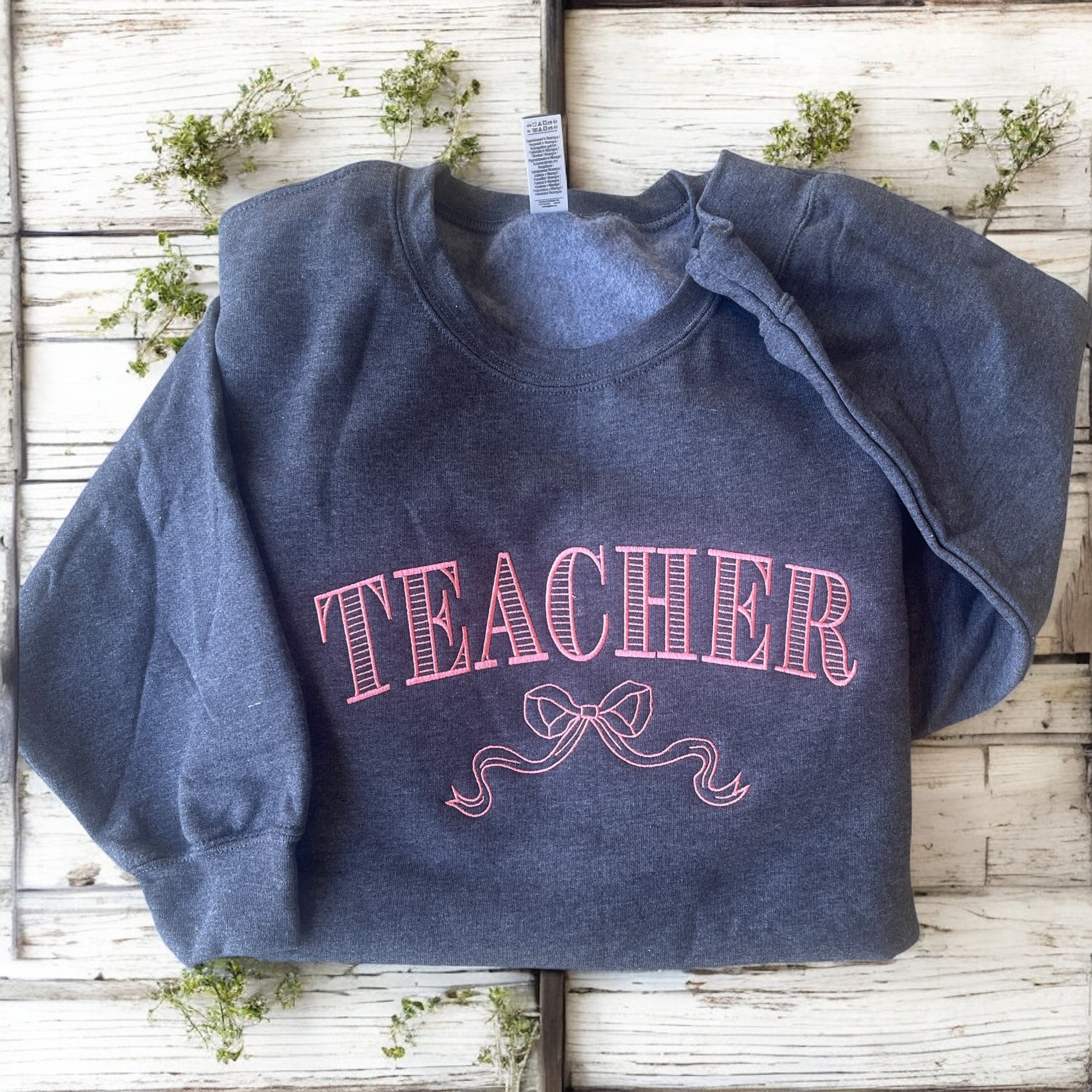 A sweet and simple sweatshirt made just for your favorite teacher. Features a bold embroidered “TEACHER” design with a dainty bow underneath. Cozy, cute, and totally customizable.