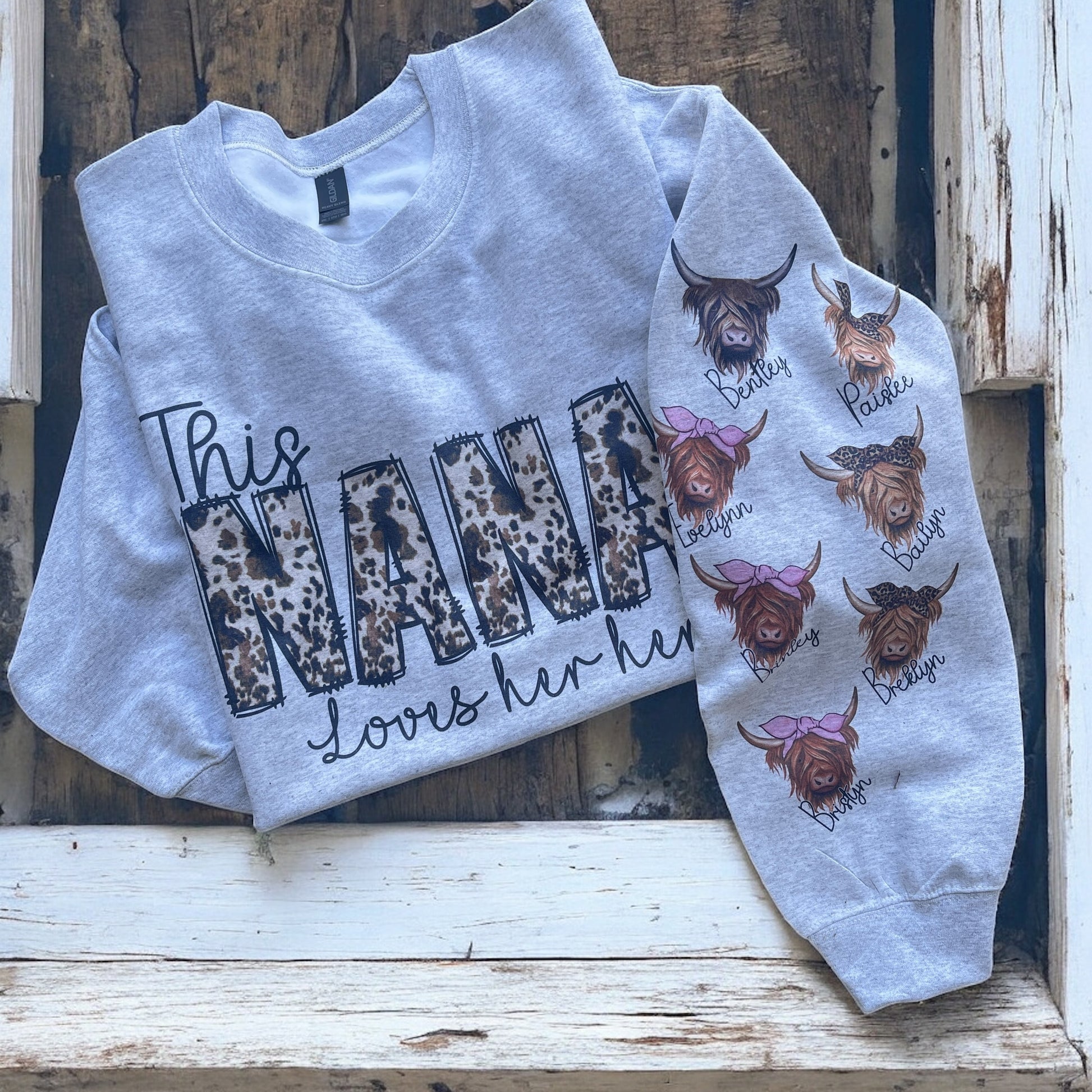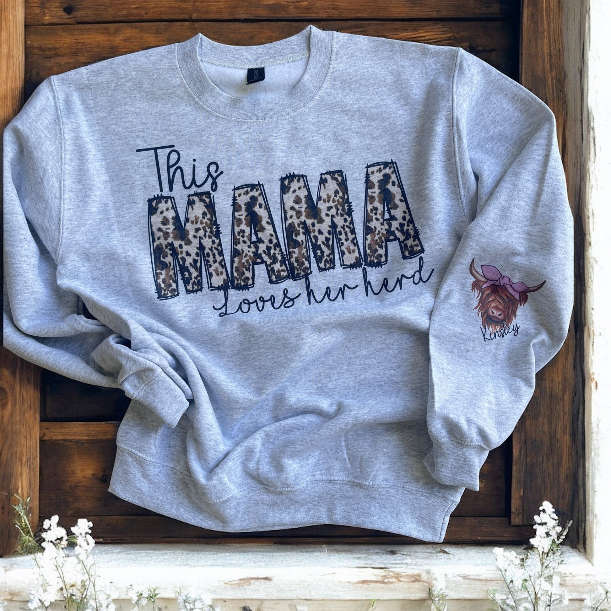 Custom Mama/Grandma Sweatshirt with Kids’ Names | Sublimated Cows on Sleeves | Personalized Gift